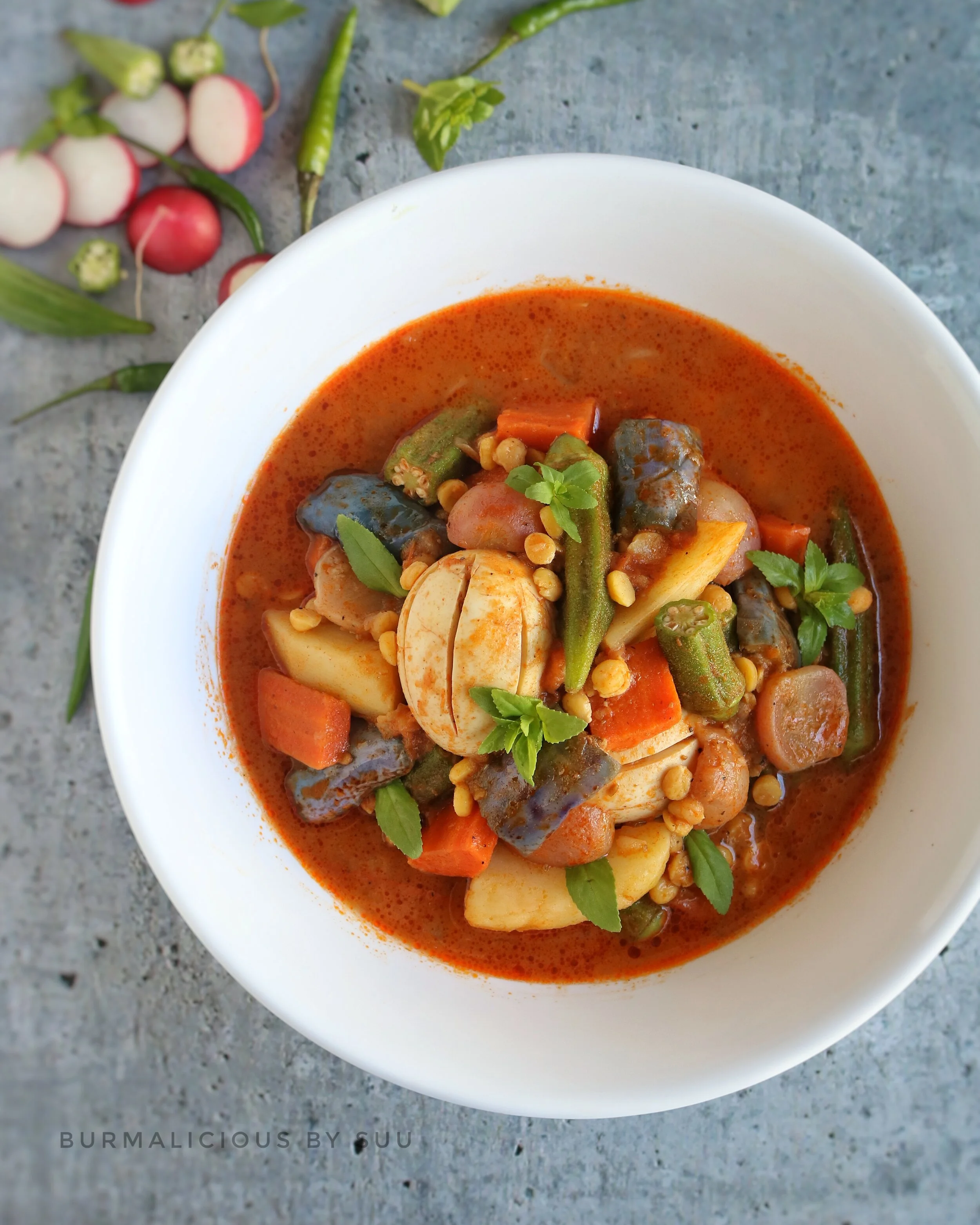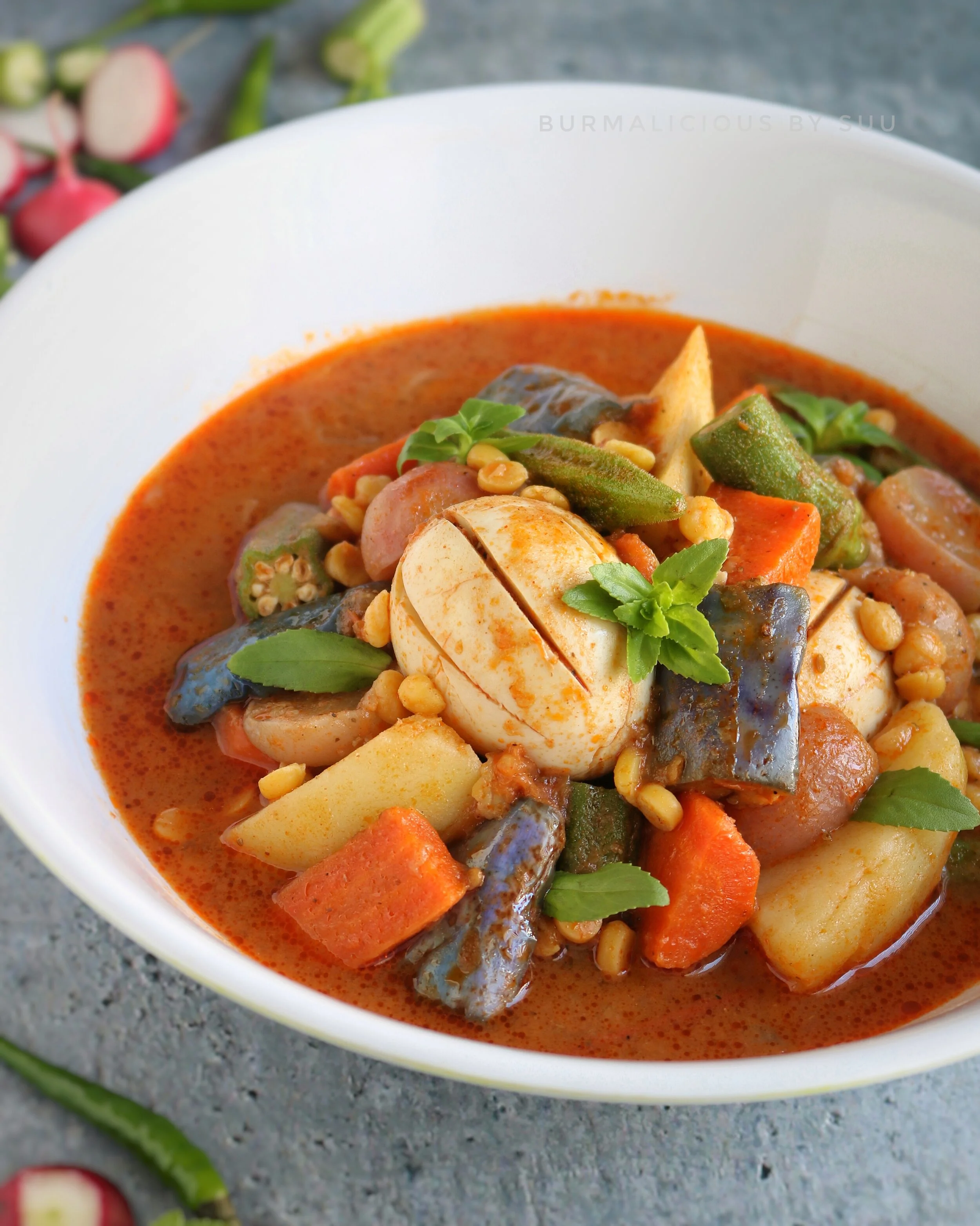 But stews are always the most efficient and reliable rescue vehicles and fall is aptly upon us. So a vegetable stew happened with radishes, okras, eggplants, carrots, tomatoes and potatoes plus some chickpeas and eggs . The stew is predominantly flavored with salty brines of either shrimp paste, fish sauce or dried salted fish. Then, the pungency of these funky ingredients are counteracted with the tang of tamarind juice and the freshly grounded spices.
