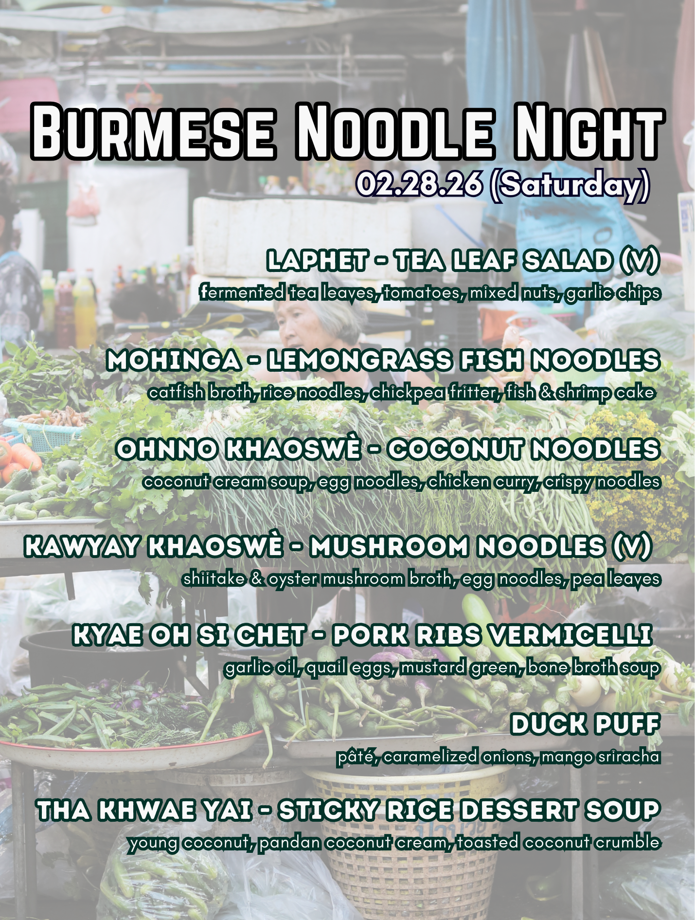 Join us for our Burmese dinner pop-up on February 28 (Saturday) at Cucharita for seatings at 6:30pm and 7:45pm.